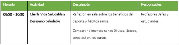 Para este día, hemos organizado un cronograma especial que incluye charlas, desayunos saludables, torneos deportivos por ciclos y dinámicas integradoras, el cual se desarrollará de la siguiente forma: