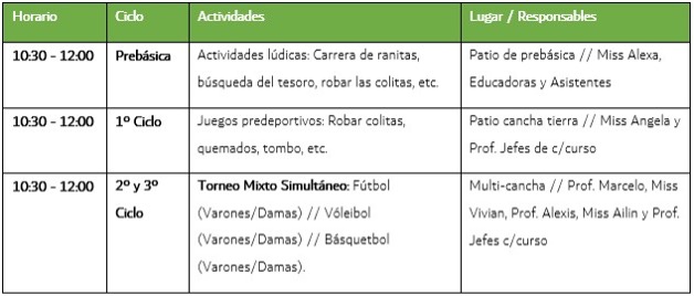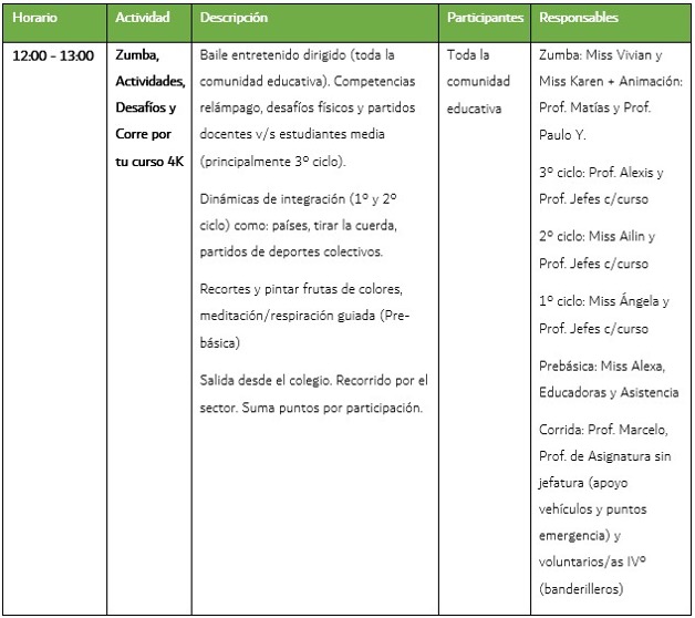 - Vestimenta: Todos los alumnos y alumnas deben asistir con el buzo oficial del colegio, o ropa deportiva cómoda en caso de que participen de la corrida.